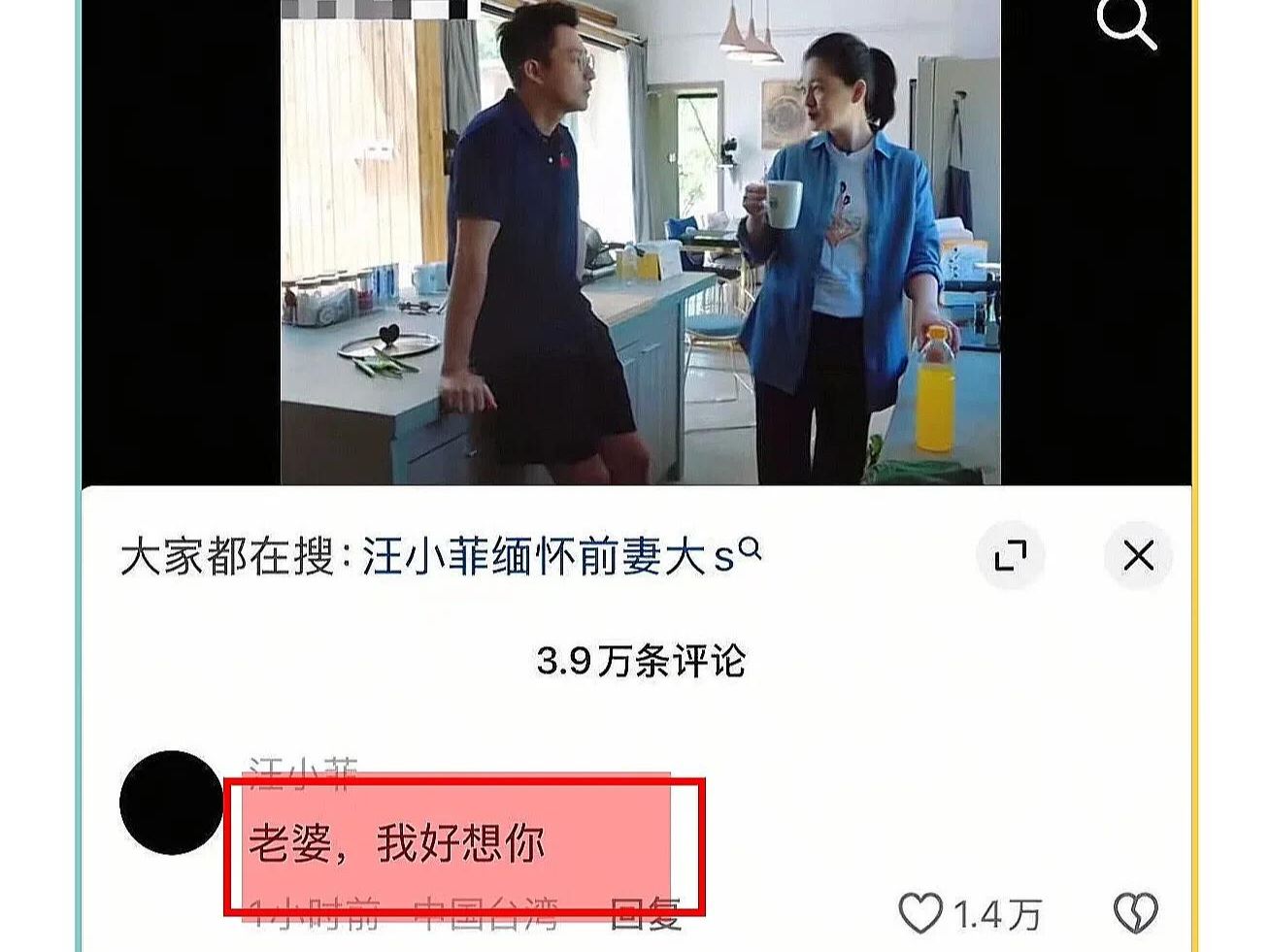 下午汪小菲在网上不停翻看他跟大s昔日在一起录制的《幸福三重奏》,再次破防了,看着昔日两个人在节目上恩爱的场景,汪小菲忍不住留言,老婆我想你,离婚三年,汪小菲首次称呼大s为老婆,有网友能理解汪小菲的痛,有网友觉得他在装,于是汪小菲回复网友,死的人应该是我!